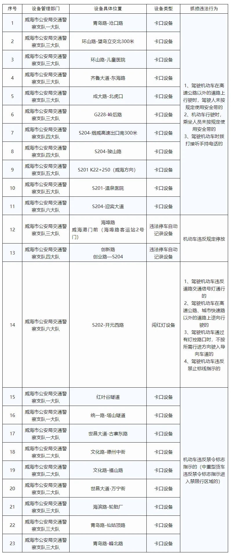 為保障道路交通安全,預(yù)防和減少交通事故的發(fā)生,根據(jù)《中華人民共和國道路交通安全法》及其實(shí)施條例等法律法規(guī)和相關(guān)技術(shù)規(guī)范的規(guī)定,依據(jù)《公安機(jī)關(guān)執(zhí)法公開規(guī)定》,現(xiàn)將新增的23處交通技術(shù)監(jiān)控設(shè)備予以公示,自2024年12月1日起,將對有關(guān)交通違法行為進(jìn)行依法管理,請廣大道路交通參與者自覺遵守相關(guān)法律法規(guī),共同維護(hù)良好的道路交通秩序。