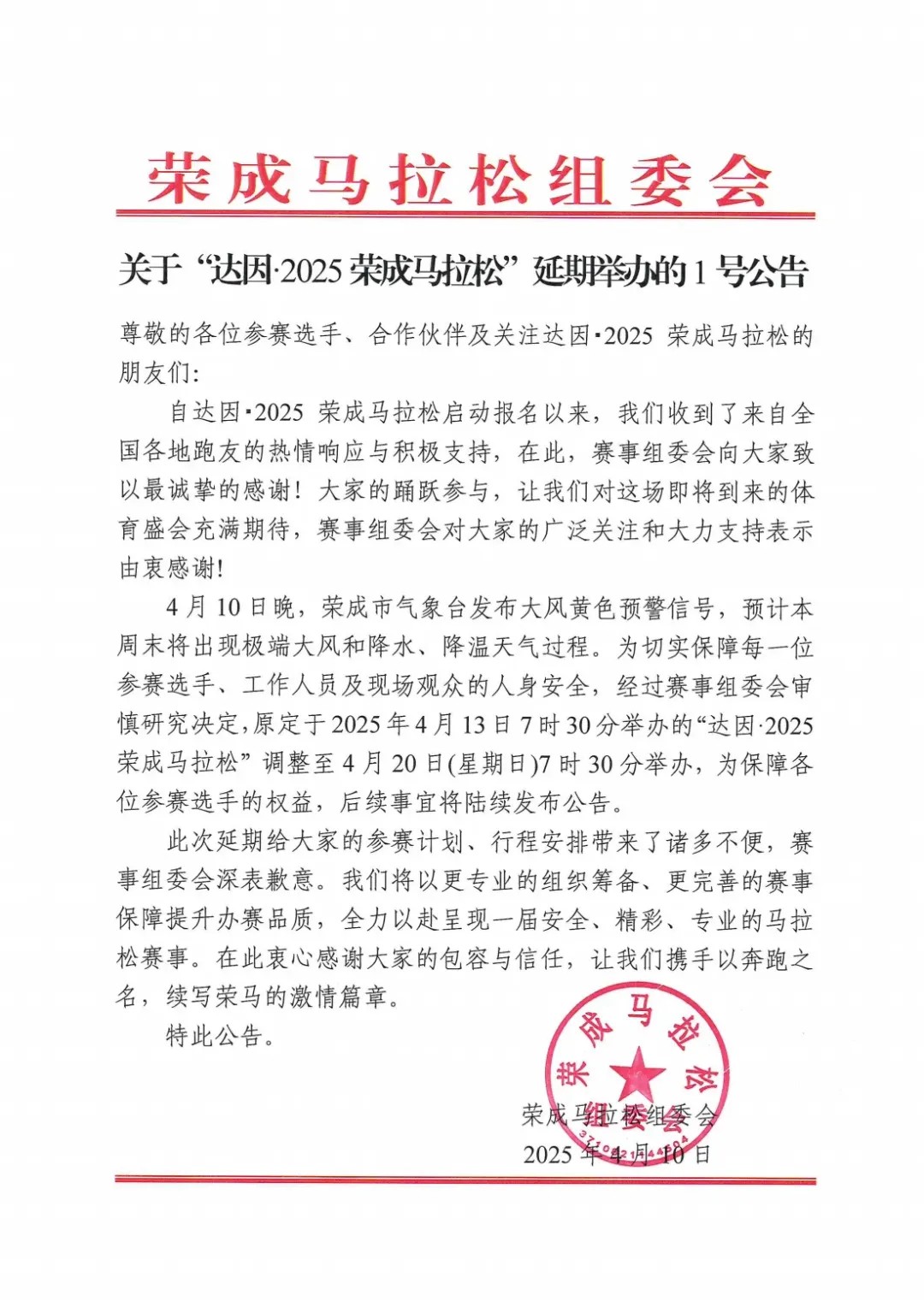 延期至4月20日,關于“達因·2025榮成馬拉松”延期舉辦的1號公告