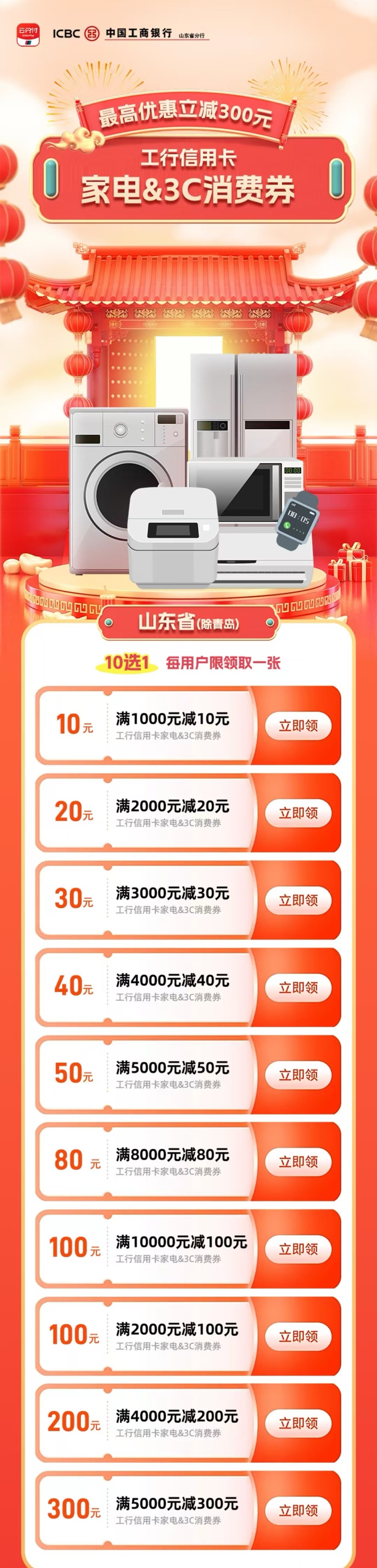 登錄云閃付APP,搜索魯惠券,人氣銀行選工商銀行,62開頭銀聯(lián)工行信用卡支付,最高滿減300元!呼朋引伴,快來參與吧!