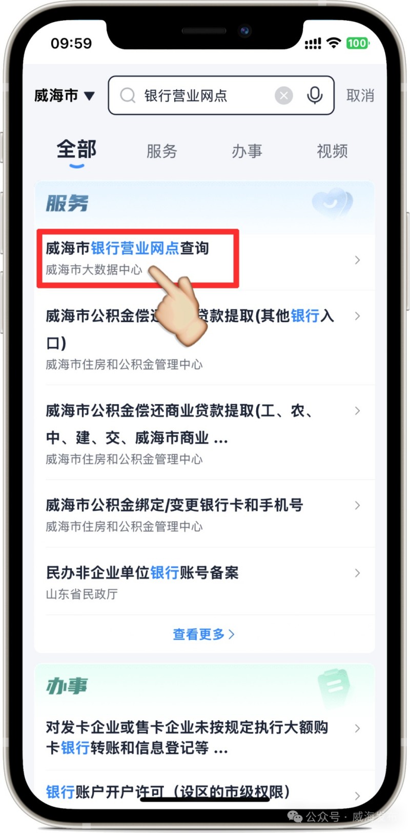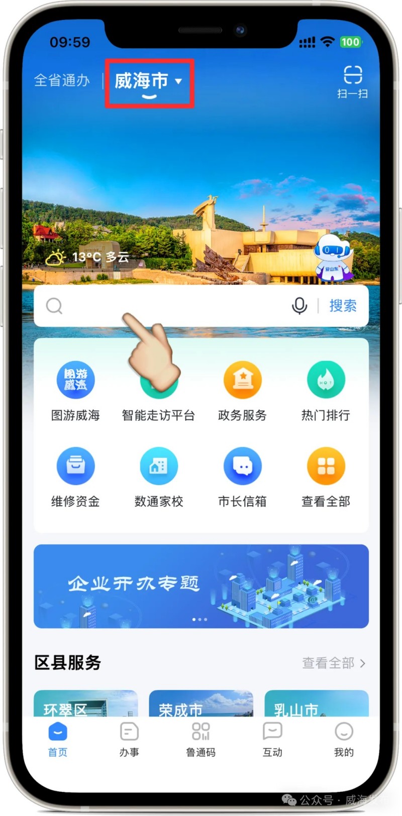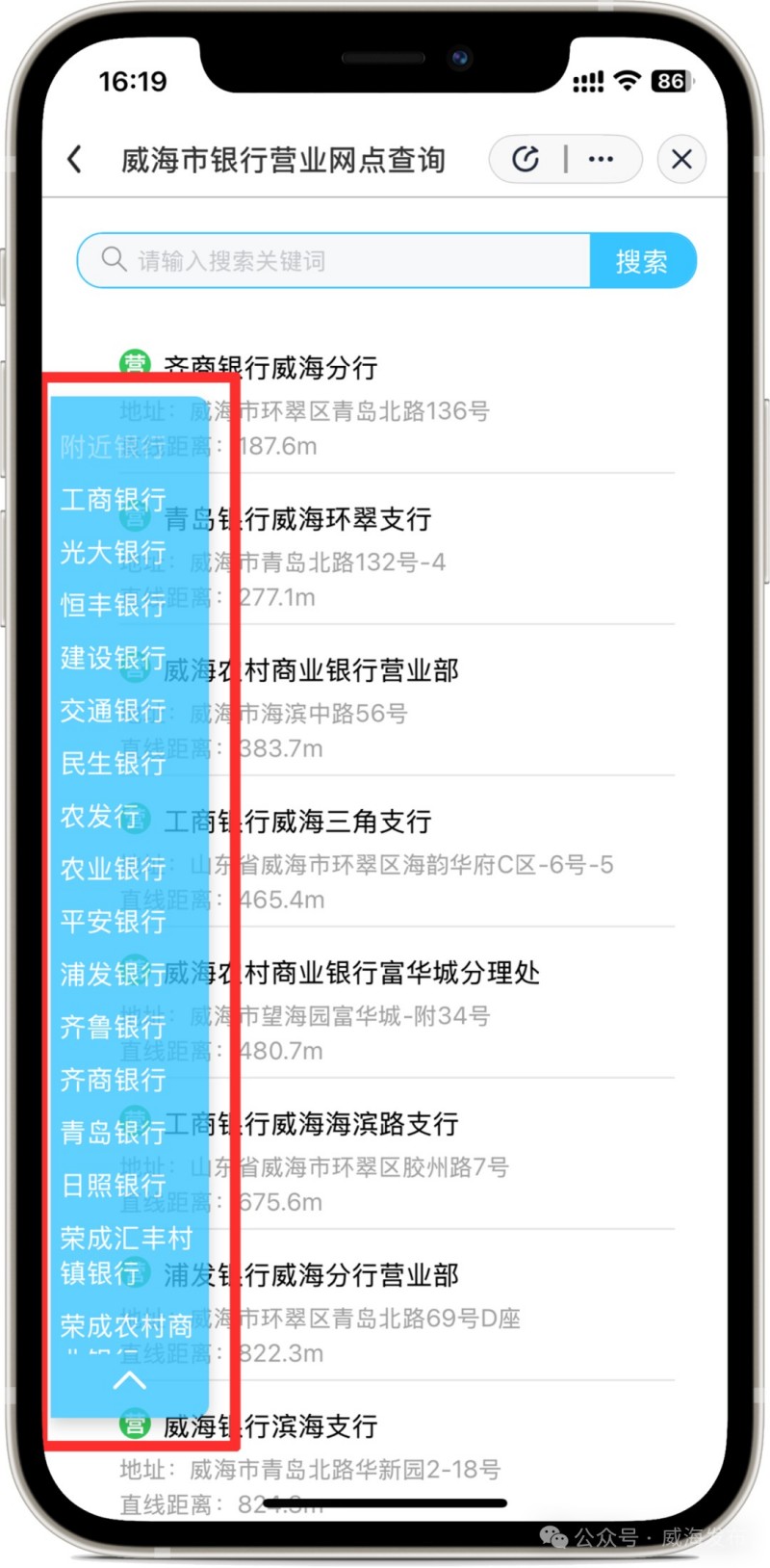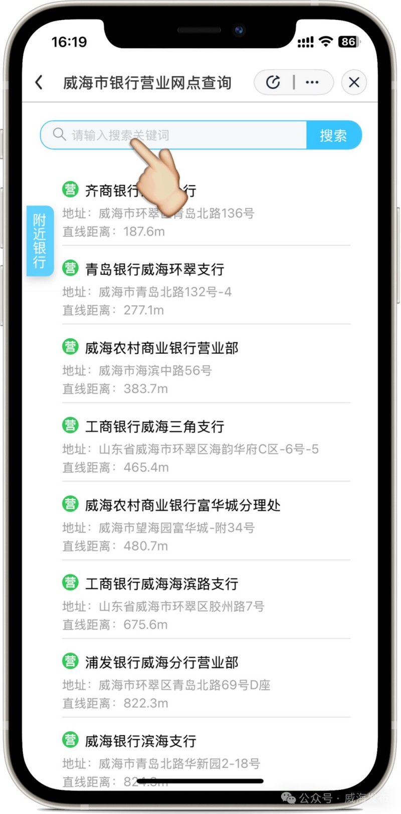 進入“愛山東”APP后,在首頁左上角選擇進入“威海市”,在搜索框搜索關(guān)鍵詞“銀行營業(yè)網(wǎng)點”,點擊進入應(yīng)用。